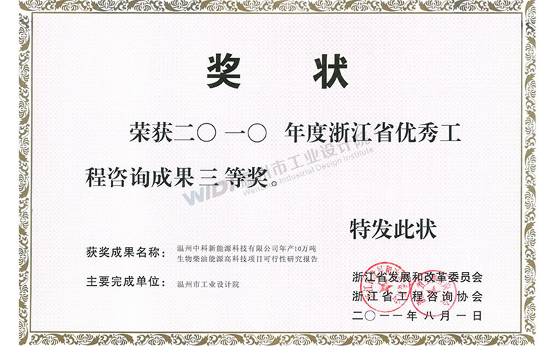 溫州中科新能源科技有限公司年產(chǎn)10萬(wàn)噸生物柴油能源高科技項(xiàng)目 甌江杯一等獎(jiǎng)